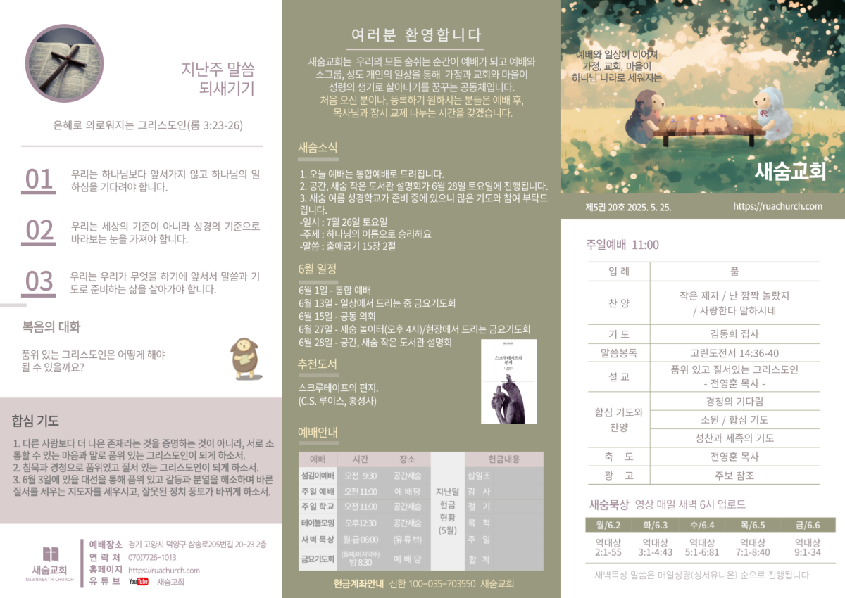 주일 예배 주보(2025-06-01) 페이지 정보 작성자 새숨교회 댓글 0건 조회 1,027회 작성일 25-05-31 18:13 목록 본문 주보입니다. 댓글 0 댓글목록 등록된 댓글이 없습니다.