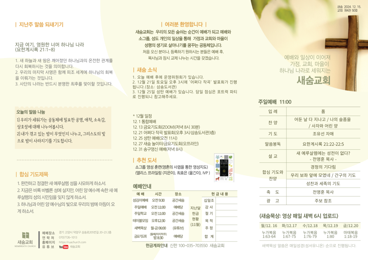 주일 예배 주보(2024-12-15) 페이지 정보 작성자 새숨교회 댓글 0건 조회 1,635회 작성일 24-12-21 19:49 목록 본문 주보입니다. 댓글 0 댓글목록 등록된 댓글이 없습니다.