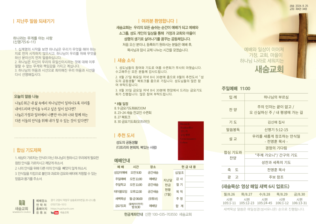 주보(2024-08-25) 페이지 정보 작성자 새숨교회 댓글 0건 조회 4,190회 작성일 24-08-31 19:47 목록 본문 주보입니다 댓글 0 댓글목록 등록된 댓글이 없습니다.