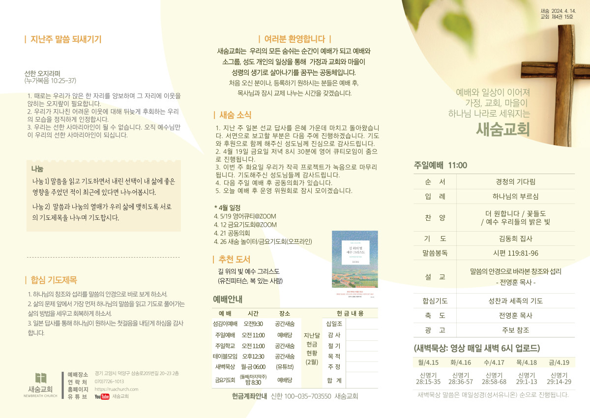 주보(2024-04-14) 페이지 정보 작성자 새숨교회 댓글 0건 조회 3,740회 작성일 24-04-13 15:12 목록 본문 주보입니다 댓글 0 댓글목록 등록된 댓글이 없습니다.