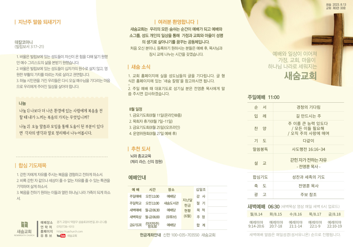 주보(2023-08-13) 페이지 정보 작성자 새숨교회 댓글 0건 조회 4,018회 작성일 23-08-13 08:56 목록 본문 주보입니다. 댓글 0 댓글목록 등록된 댓글이 없습니다.