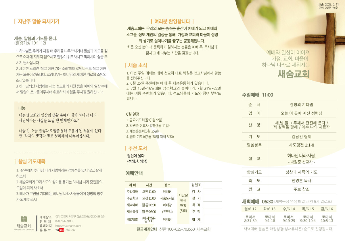 주보(2023-06-11) 페이지 정보 작성자 새숨교회 댓글 0건 조회 3,865회 작성일 23-06-11 09:44 목록 본문 주보입니다 댓글 0 댓글목록 등록된 댓글이 없습니다.