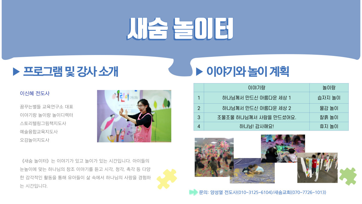 새숨놀이터가 시작됩니다 (7월 15일) 페이지 정보 작성자 새숨교회 댓글 0건 조회 1,202회 작성일 23-07-01 16:01 목록 본문 7월 15일부터 시작되는 새숨놀이터를 위해서 기도 부탁드립니다. 댓글 0 댓글목록 등록된 댓글이 없습니다.