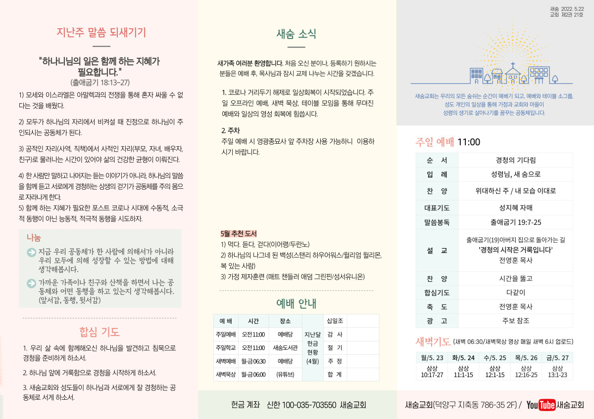 주보(2022-05-22) 페이지 정보 작성자 새숨교회 댓글 0건 조회 4,305회 작성일 22-05-26 11:52 목록 본문 주보(2022-05-15) 댓글 0 댓글목록 등록된 댓글이 없습니다.