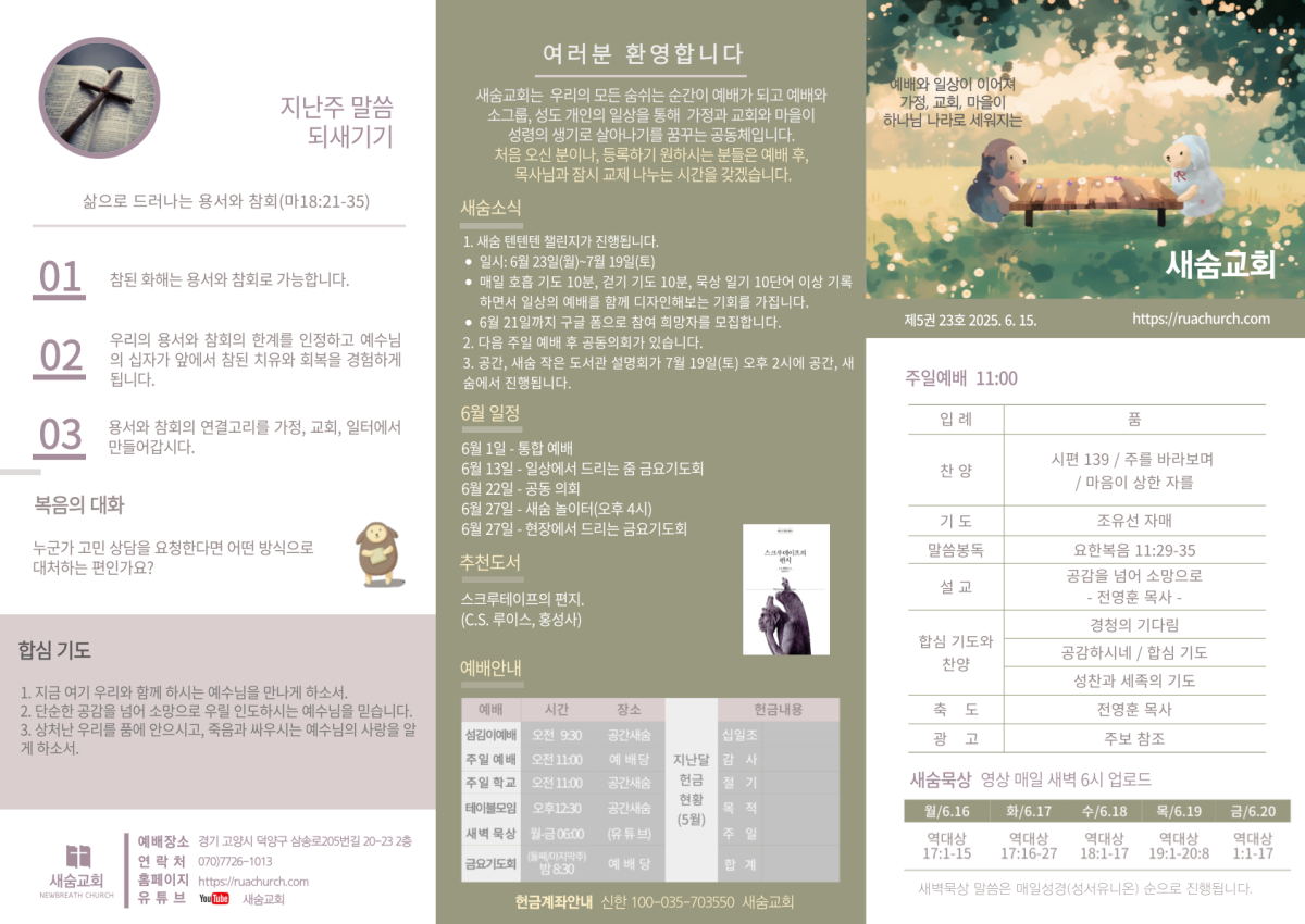 주일 예배 주보(2025-06-15) 페이지 정보 작성자 새숨교회 댓글 0건 조회 1,084회 작성일 25-06-15 01:30 목록 본문 주보입니다. 댓글 0 댓글목록 등록된 댓글이 없습니다.