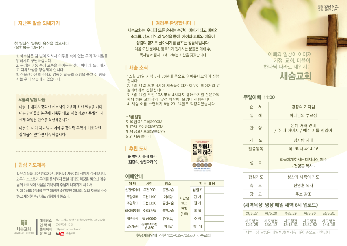 주보(2024-05-26) 페이지 정보 작성자 새숨교회 댓글 0건 조회 3,659회 작성일 24-05-25 11:55 목록 본문 주보입니다 댓글 0 댓글목록 등록된 댓글이 없습니다.