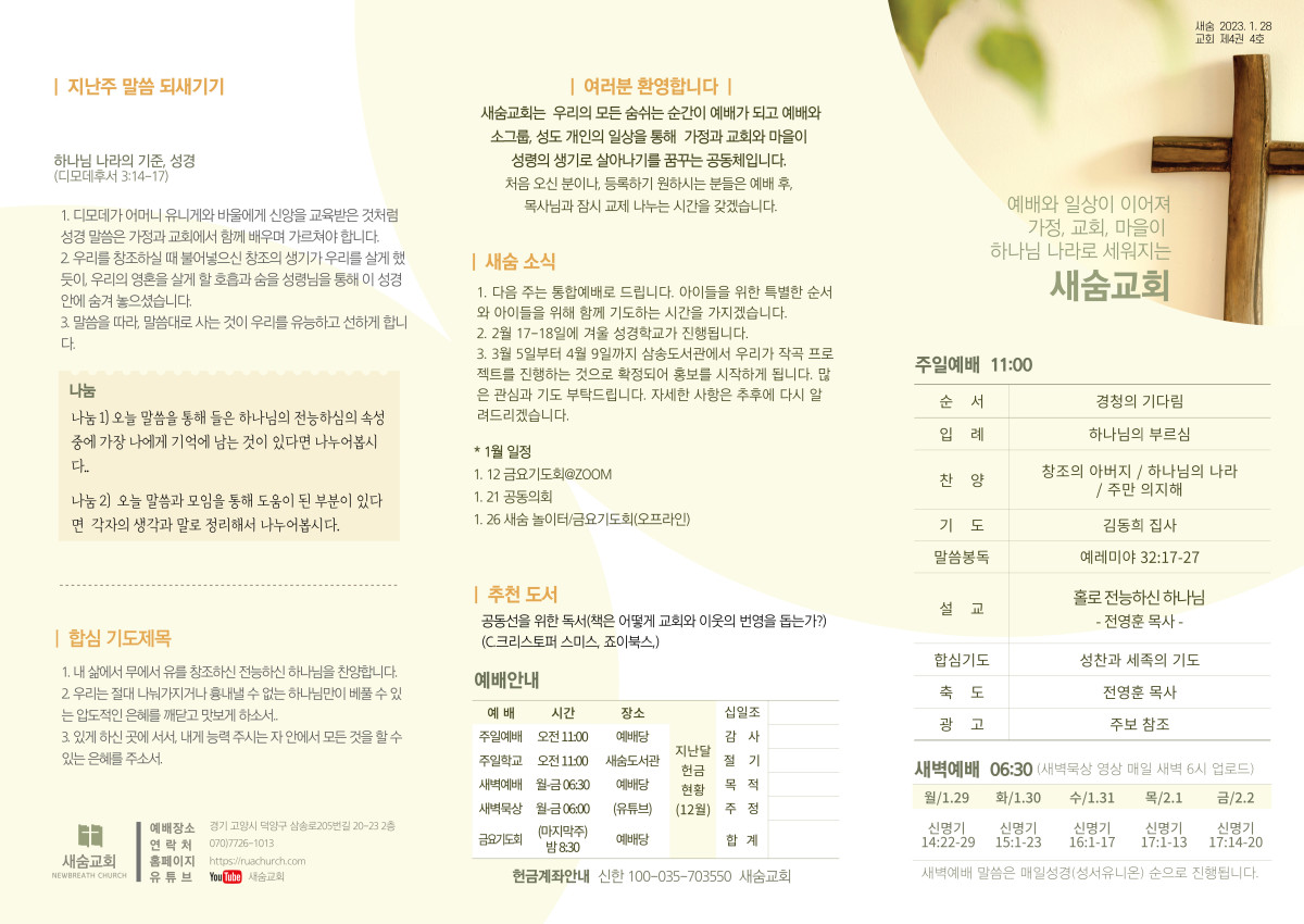 주보(2024-01-28) 페이지 정보 작성자 새숨교회 댓글 0건 조회 4,009회 작성일 24-01-28 09:06 목록 본문 주보입니다. 댓글 0 댓글목록 등록된 댓글이 없습니다.