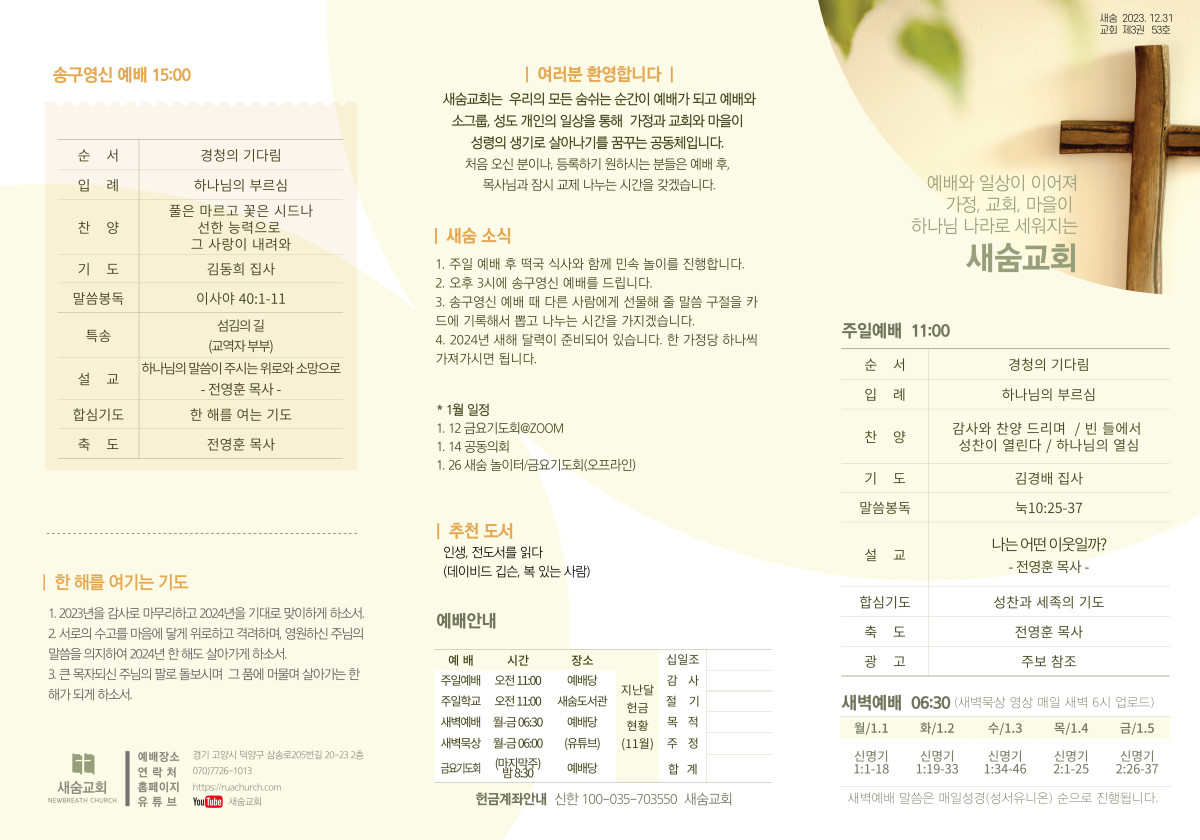 주보(2023-12-31) 페이지 정보 작성자 새숨교회 댓글 0건 조회 3,947회 작성일 23-12-30 22:57 목록 본문 주보입니다. 댓글 0 댓글목록 등록된 댓글이 없습니다.