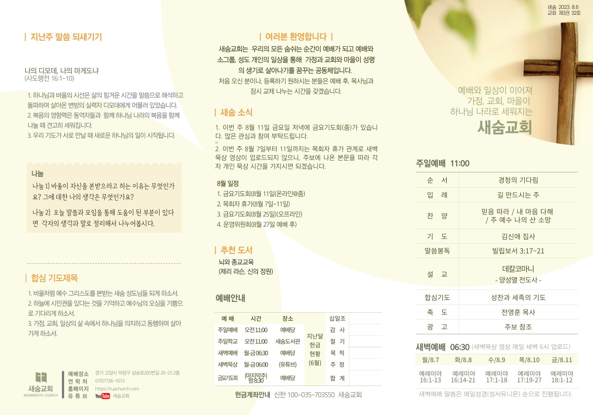 주보(2023-08-06) 페이지 정보 작성자 새숨교회 댓글 0건 조회 3,938회 작성일 23-08-06 15:15 목록 본문 주보입니다. 댓글 0 댓글목록 등록된 댓글이 없습니다.
