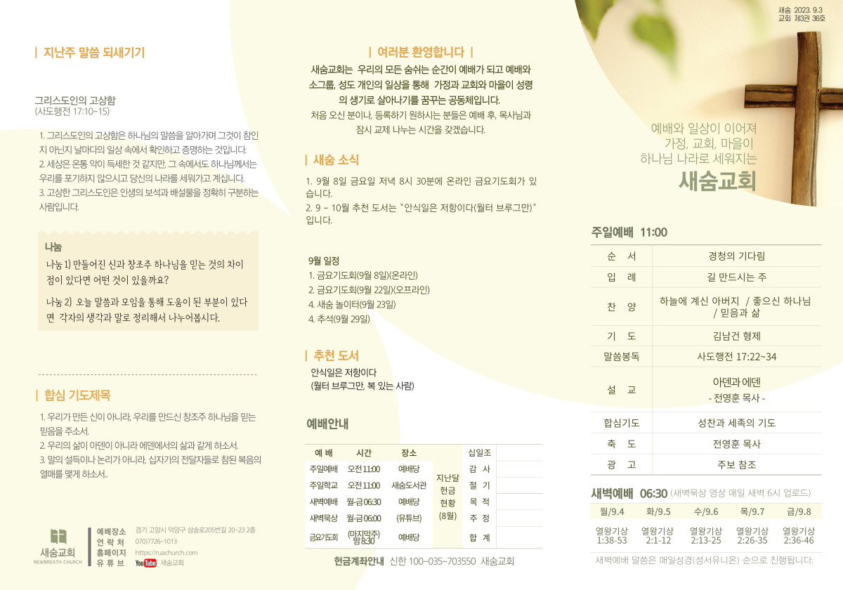 주보(2023-09-03) 페이지 정보 작성자 새숨교회 댓글 0건 조회 3,913회 작성일 23-09-02 14:28 목록 본문 주보입니다 댓글 0 댓글목록 등록된 댓글이 없습니다.