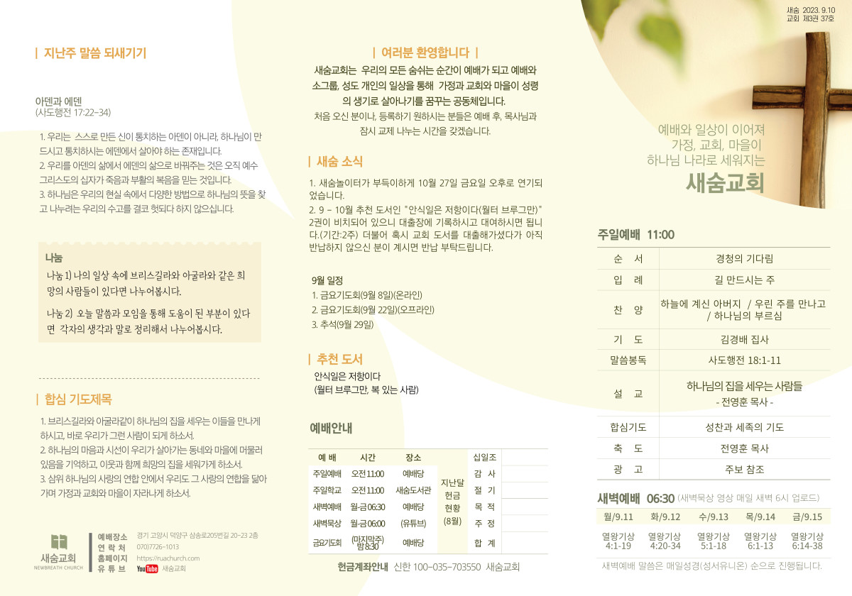 주보(2023-09-10) 페이지 정보 작성자 새숨교회 댓글 0건 조회 4,113회 작성일 23-09-10 12:54 목록 본문 주보입니다. 댓글 0 댓글목록 등록된 댓글이 없습니다.