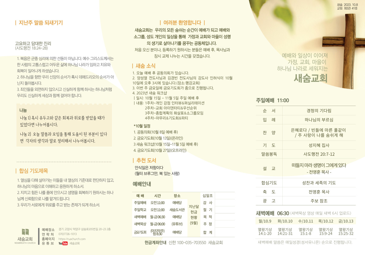 주보(2023-10-08) 페이지 정보 작성자 새숨교회 댓글 0건 조회 3,965회 작성일 23-10-07 12:37 목록 본문 주보입니다 댓글 0 댓글목록 등록된 댓글이 없습니다.