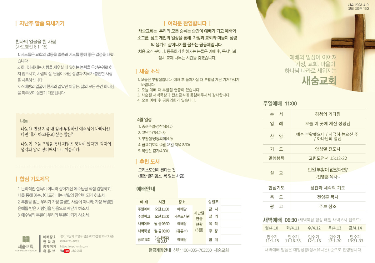 주보(2023-04-09) 페이지 정보 작성자 새숨교회 댓글 0건 조회 4,103회 작성일 23-04-08 20:14 목록 본문 주보입니다 댓글 0 댓글목록 등록된 댓글이 없습니다.
